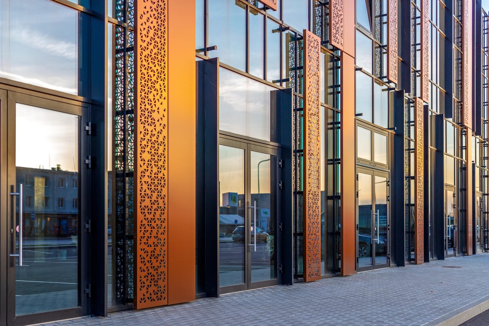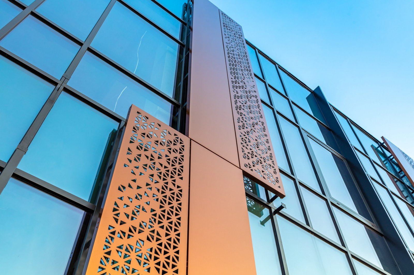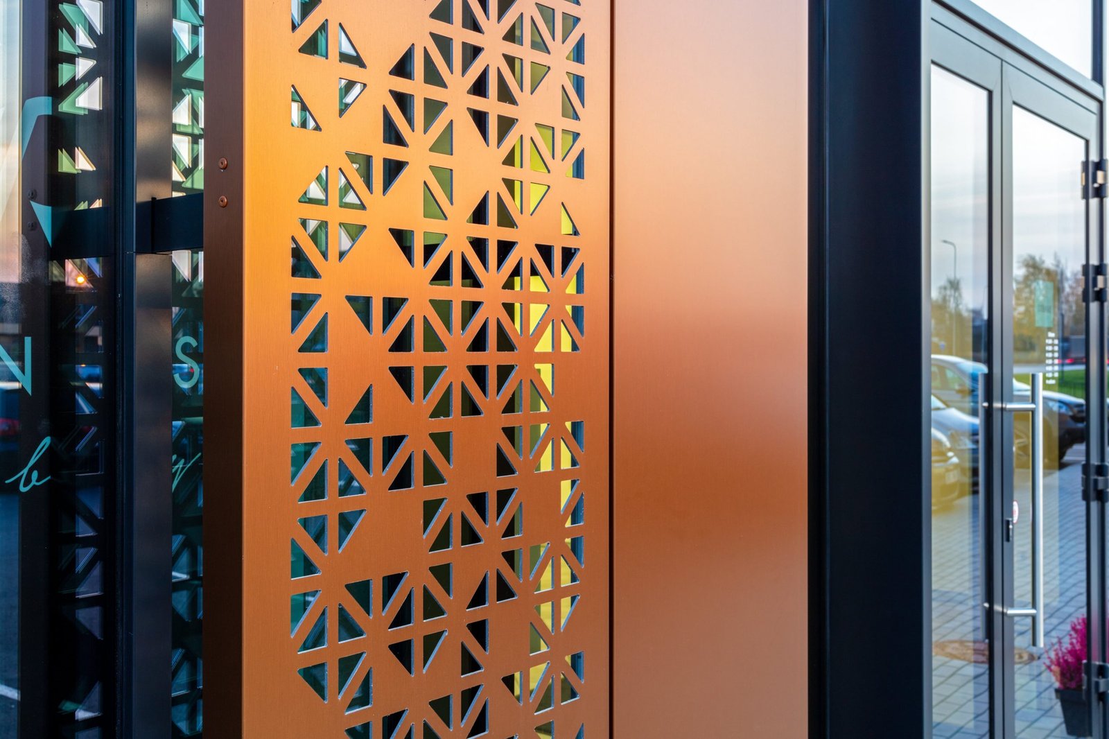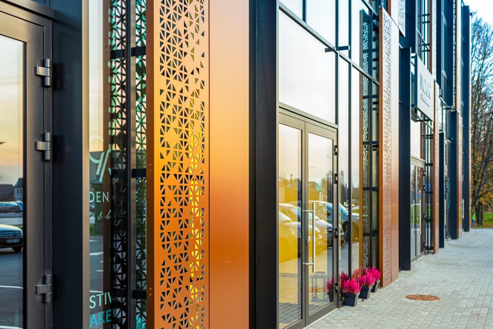 Ypatumai: Unikali ALUCOBOND kasetinė pakabinama sistema, perforuota CNC.