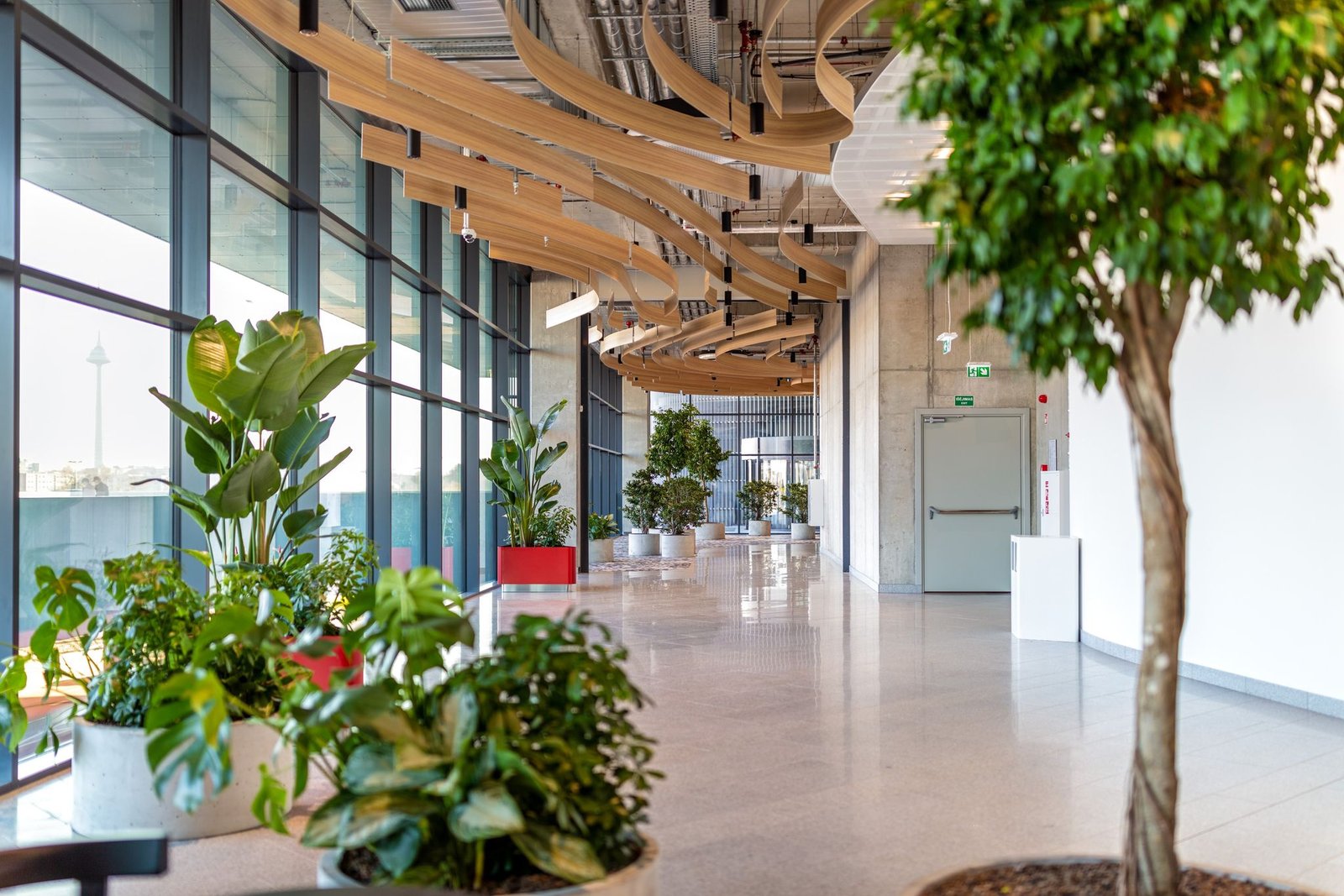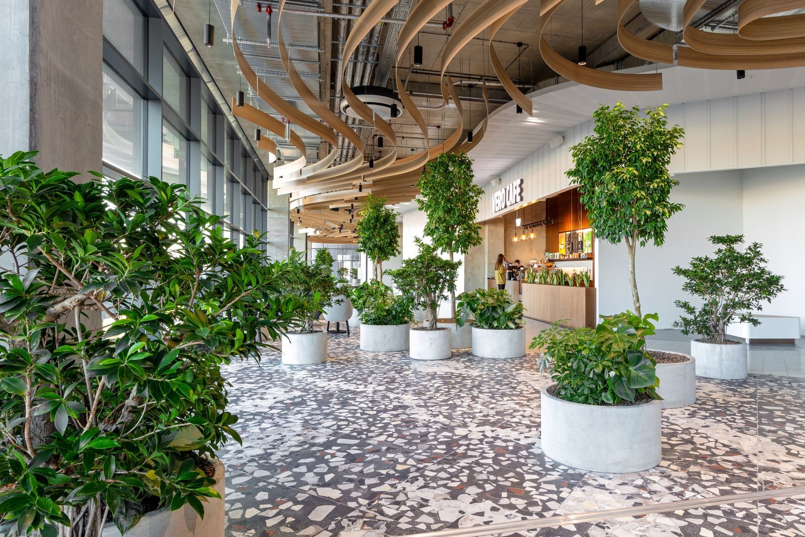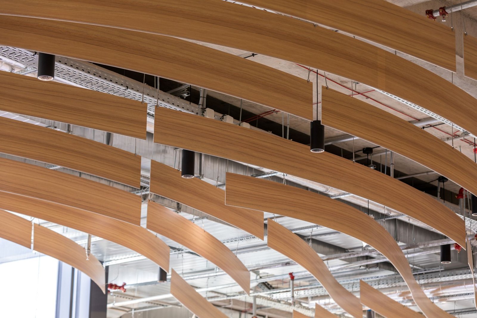Ypatumai: Valcuotų Alucobond juostų lubos.